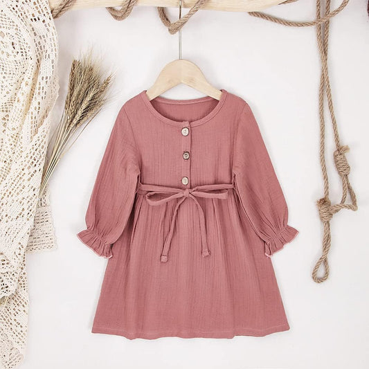 Toddler Baby Girl Cotton Linen Dress Long Sleeve Crew Neck Dresses Button down Dresses Casual Spring Fall Dress